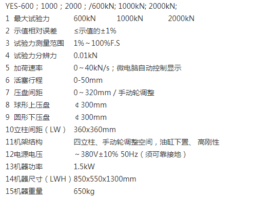 產品規格 YES-600;1000;2000;600kN;1000kN;;2000kN;YES系列經濟型數顯式壓力試驗機